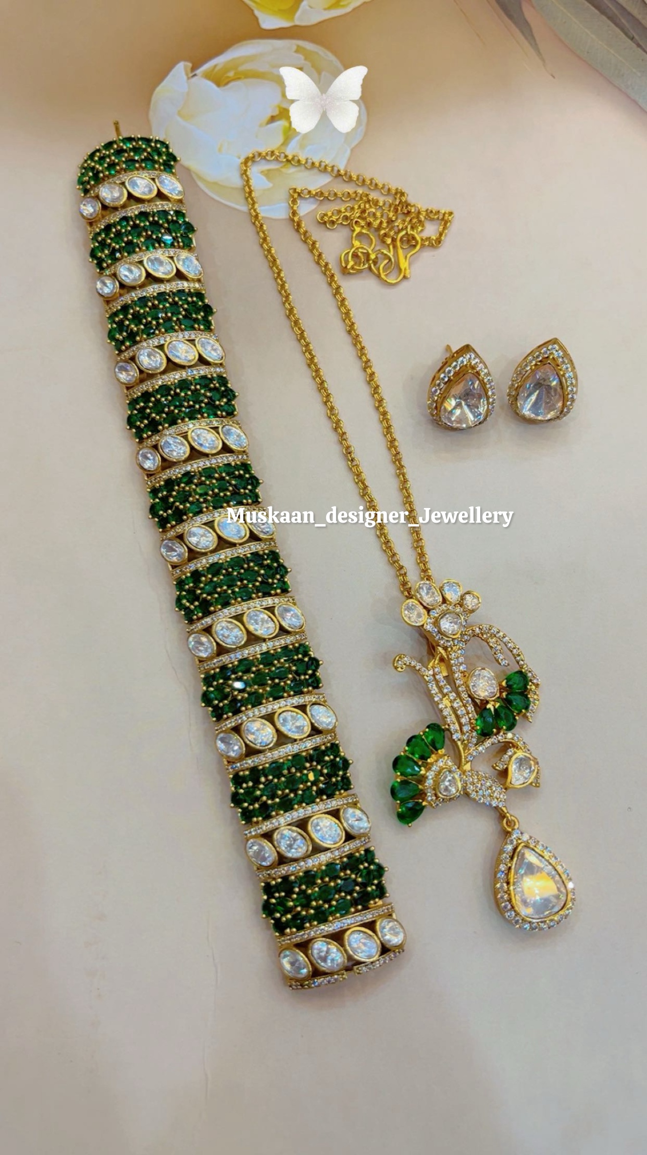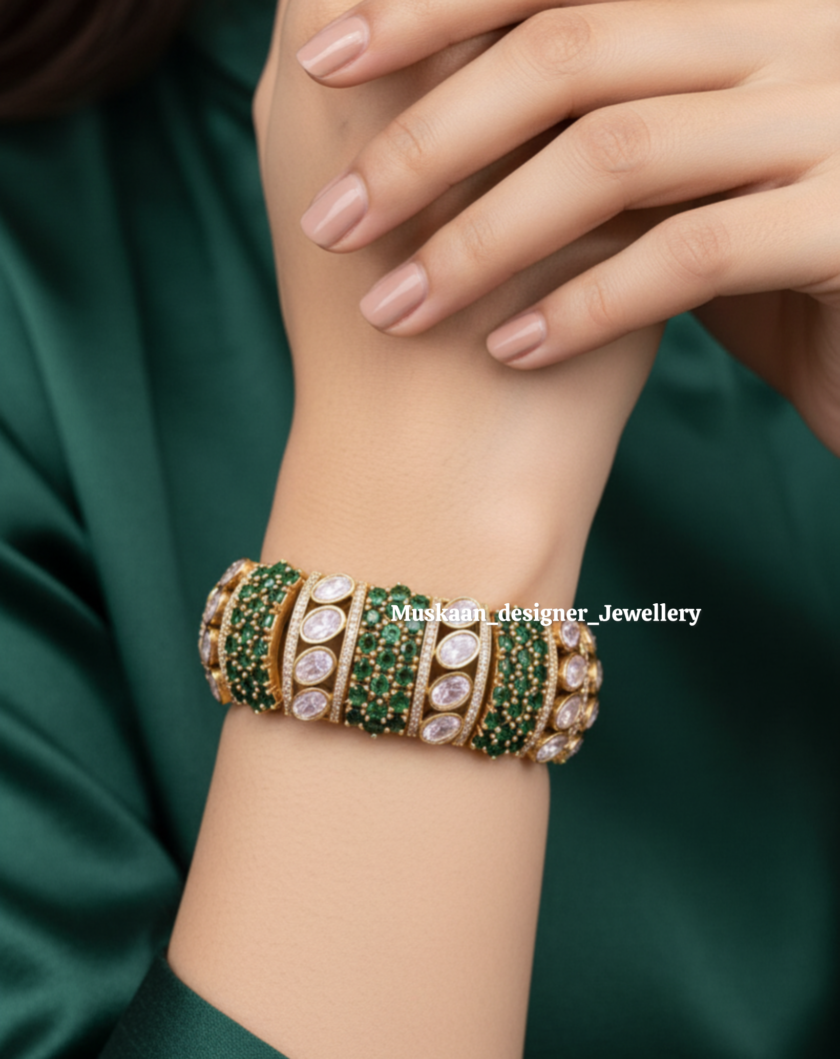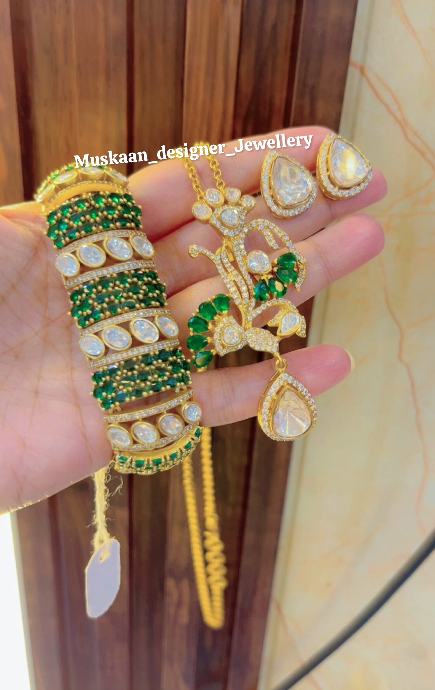 Light up your style with the Emerald Aura Combo from Muskaan Designer Jewellery. This luxurious set combines a sparkling tennis bracelet with a stunning Moissanite Polki pendant set, all accented by rich emerald-green tones. Featuring a premium gold-plated finish, this combo is designed to provide a high-end, timeless look for any festive or formal occasion.