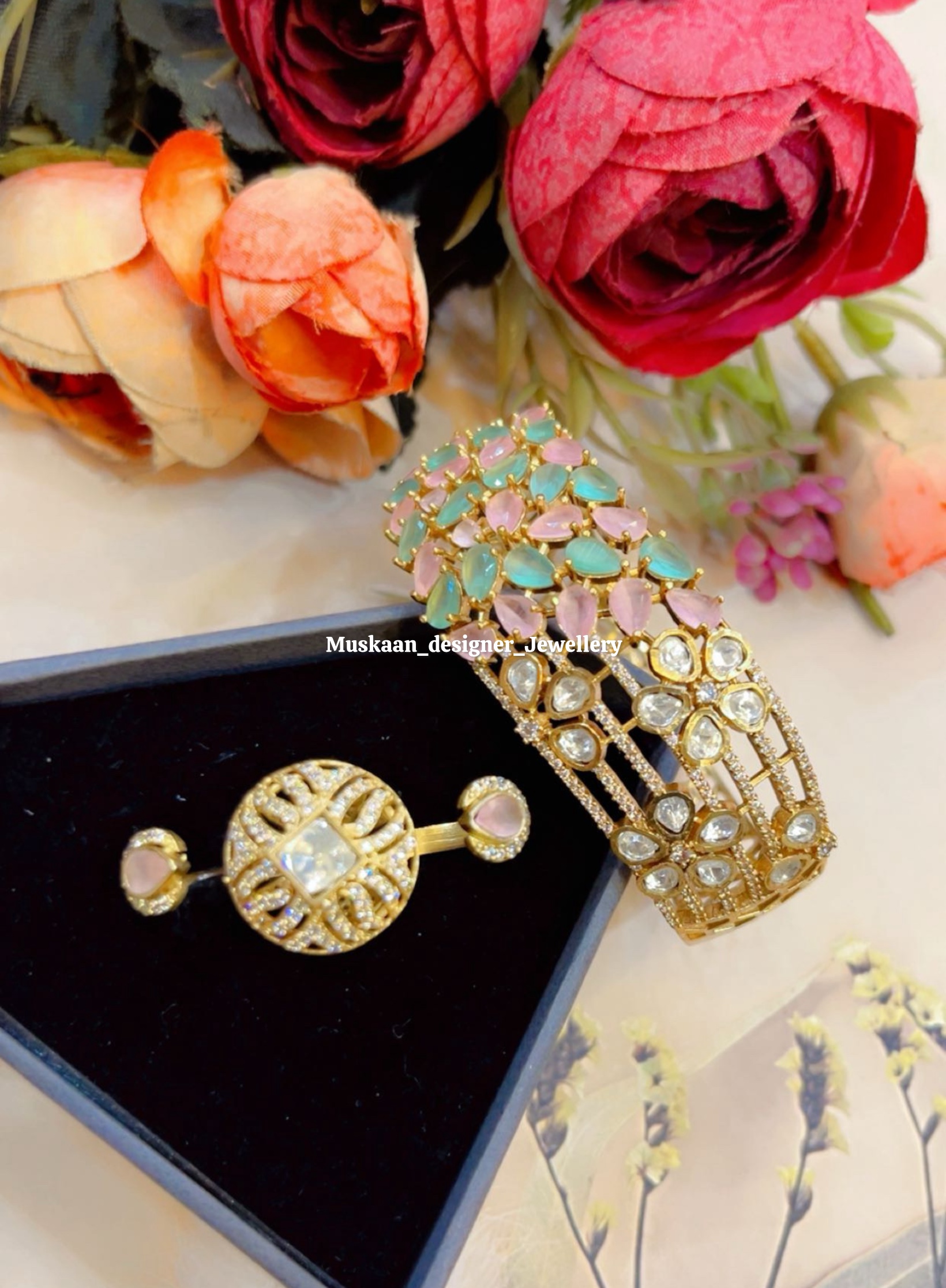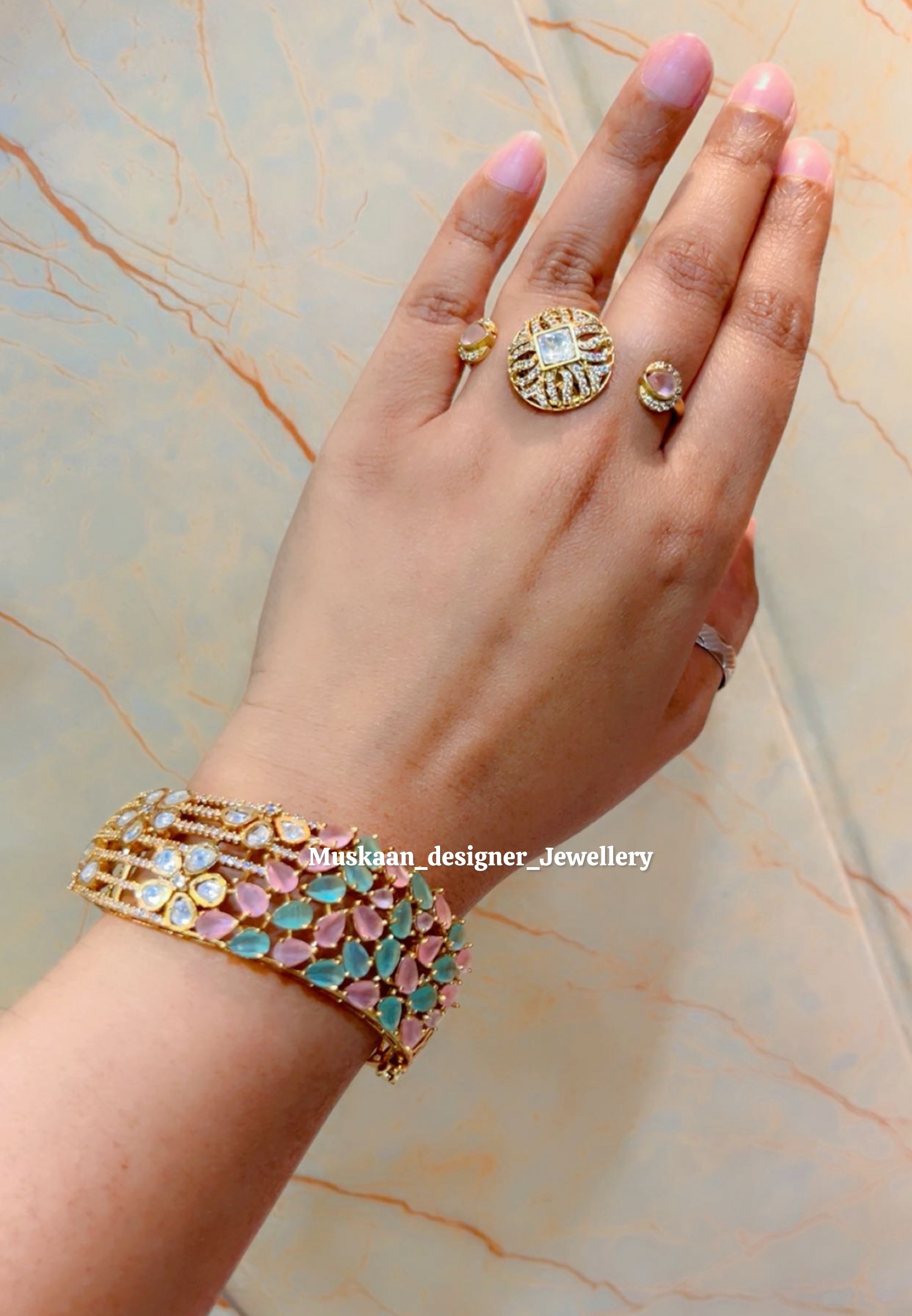 Bring a touch of vintage charm to your collection with the Gulati Mint Polki Duo by Muskaan Designer Jewellery. This elegant set features a beautifully detailed Kada and a unique double-finger ring, both decorated with soft Mint Polki stones and sparkling Moissanite accents. The matte gold finish provides a sophisticated, antique look that is perfect for any traditional occasion.