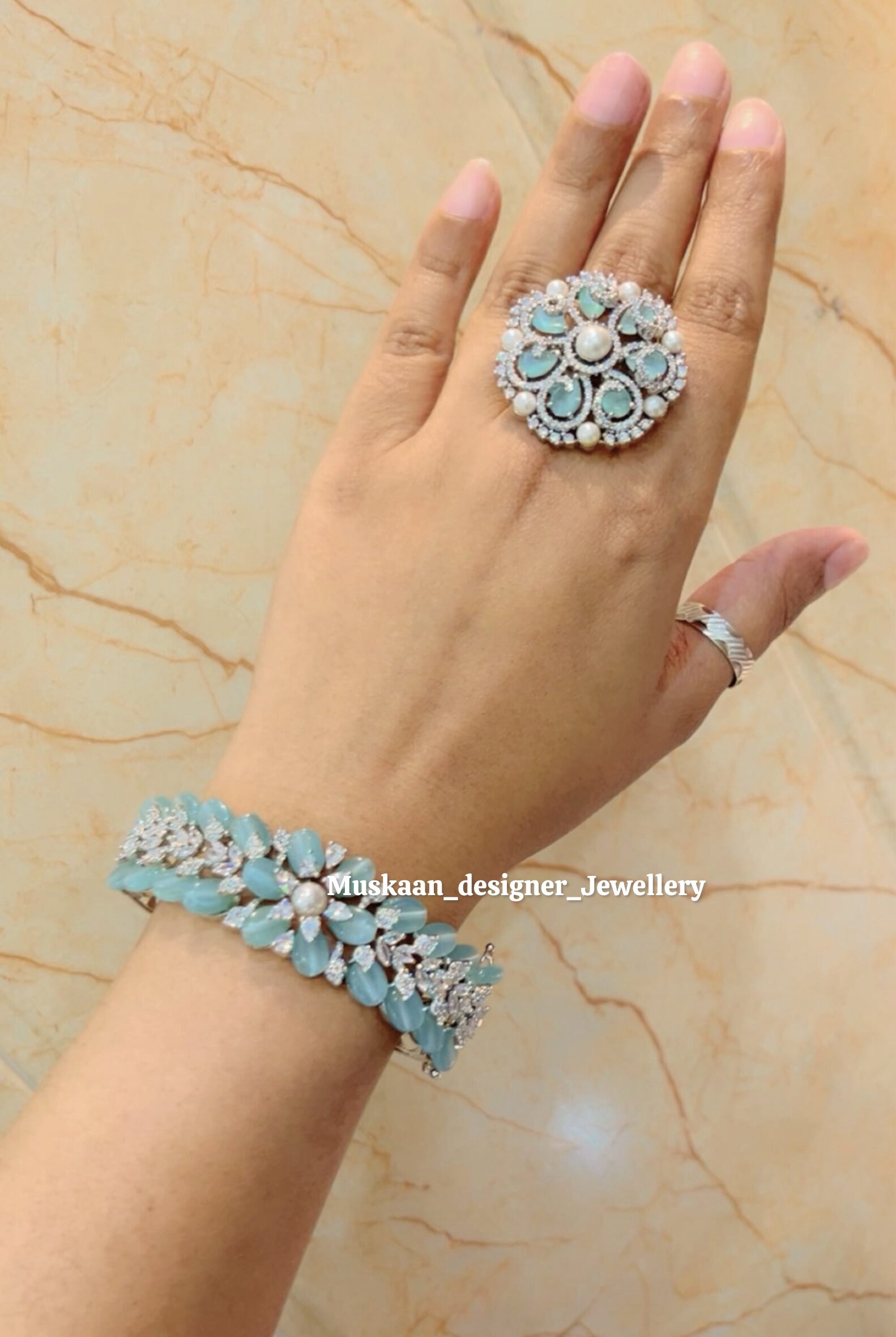 Add a fresh and bright touch to your look with the Petals of Azure set from Muskaan Designer Jewellery. This beautiful combo features a floral-themed Kada and a matching ring, both set with sparkling Azure blue stones and clear CZ stones. The high-quality Silver Plating gives it a modern, diamond-like shine that is perfect for any special occasion.