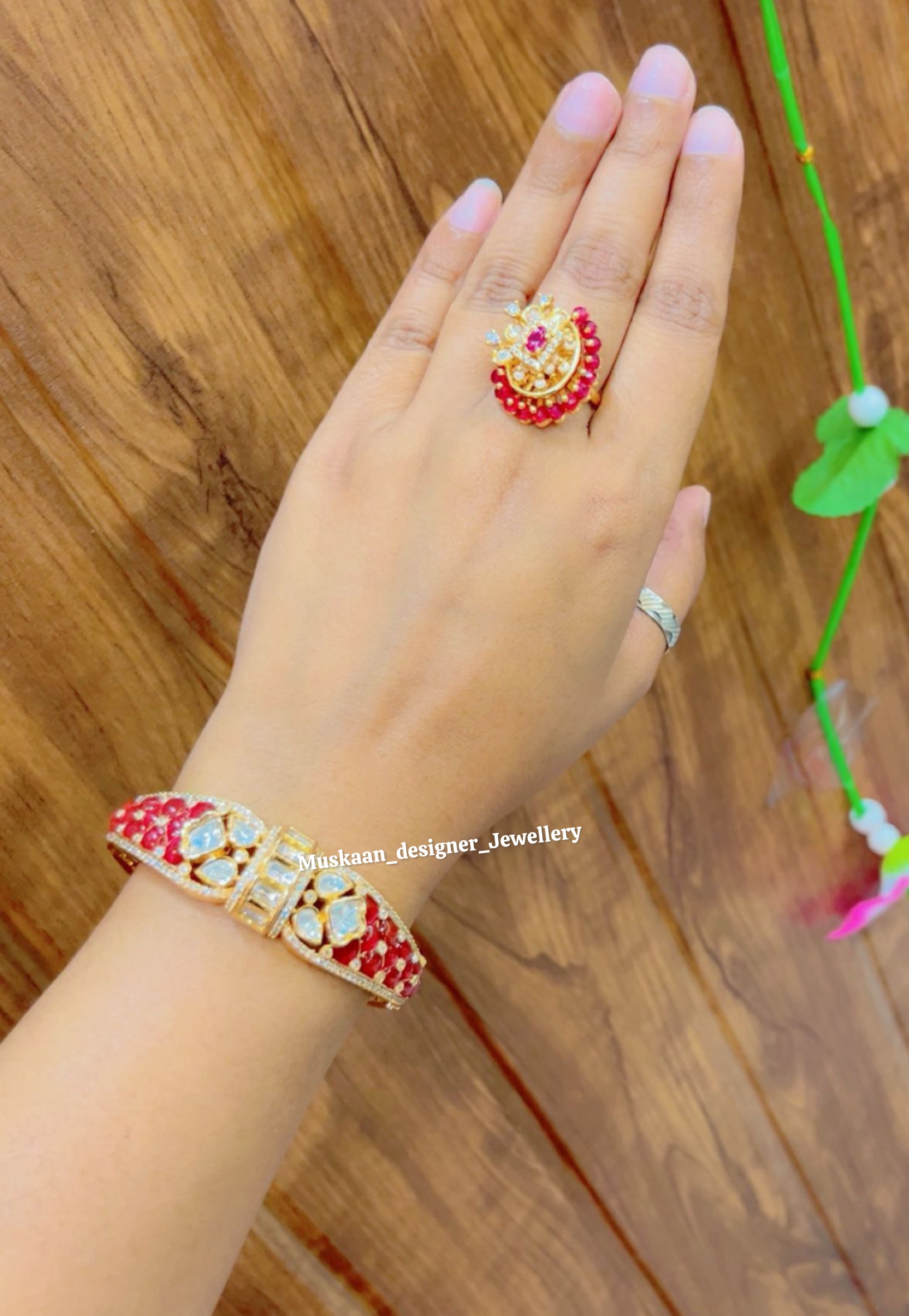 Light up your style with The Noor Polki Duo, a stunning jewelry set from Muskaan Designer Jewellery. This combo features a beautifully crafted Kada and a matching ring, both sparkling with premium Moissanite Polki stones. With a rich Gold Plated finish and traditional green enamel accents, this set is perfect for weddings, parties, and festive celebrations.