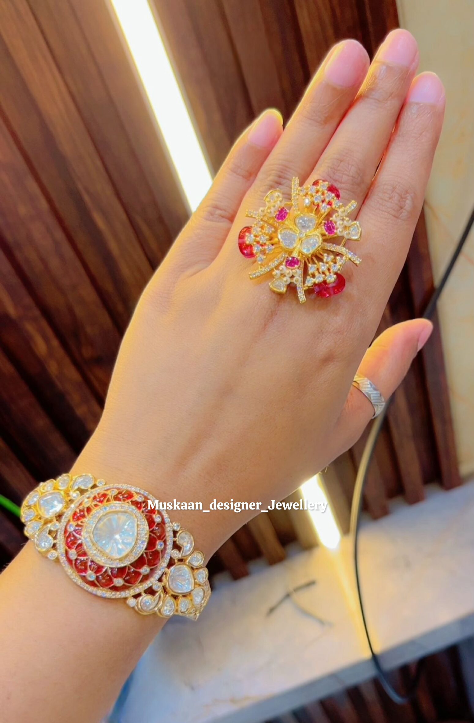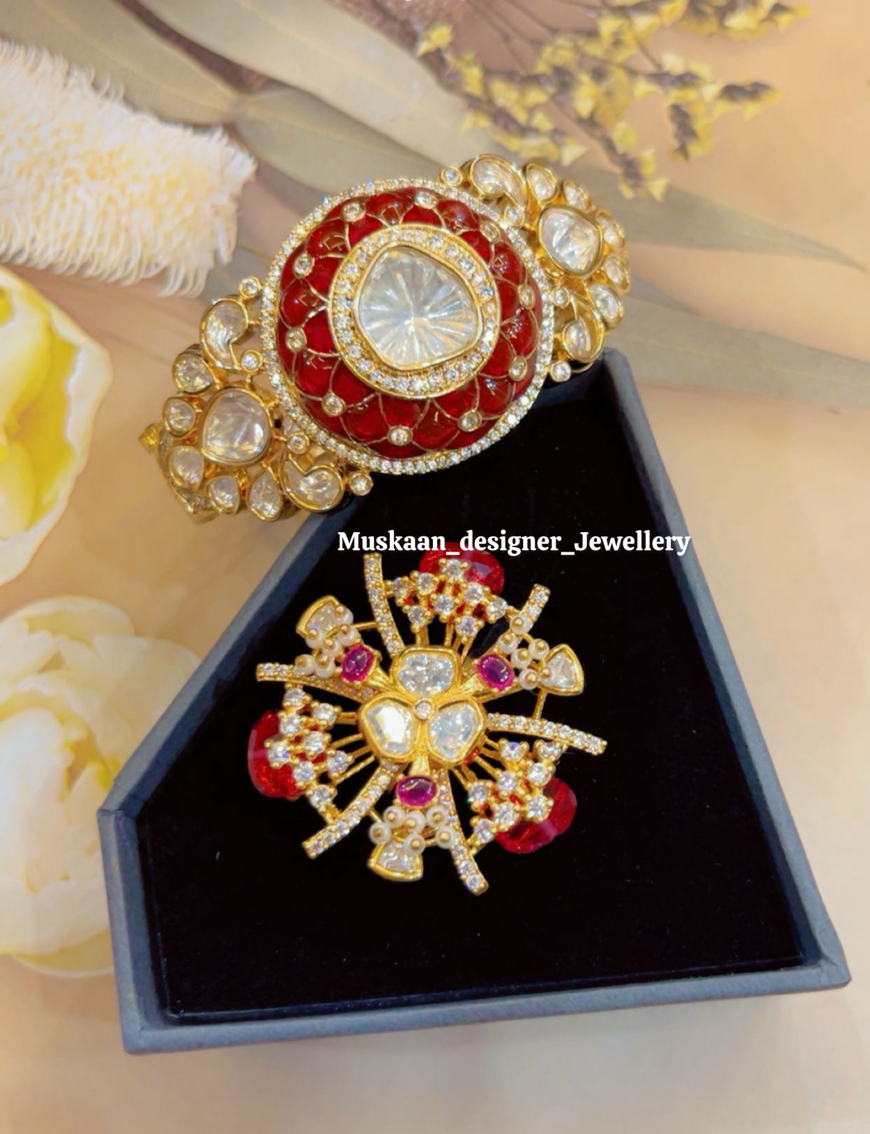 Add a touch of royal charm to your look with the Zoya Moissanite Combo from Muskaan Designer Jewellery. This stunning set features a premium openable Kada and a matching adjustable ring, both showcasing the brilliant spark of Moissanite stones set against a rich, deep red enamel background. Designed for the modern woman who loves traditional craftsmanship, this combo is perfect for weddings, festivals, and special celebrations.