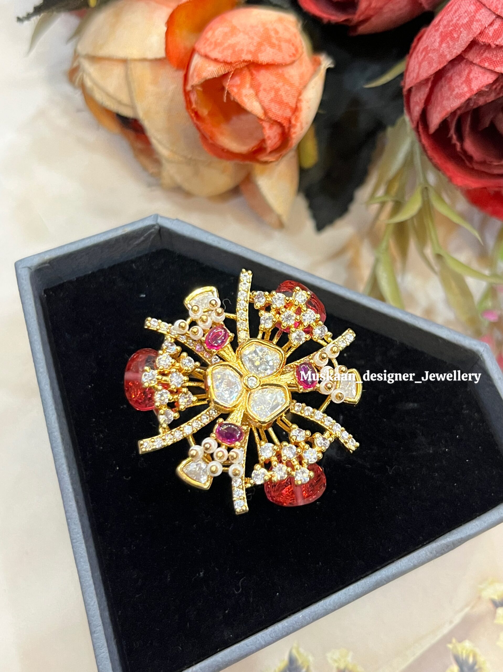 • Design: Intricate floral patterns with a bold red center stone and brilliant Moissanite accents.